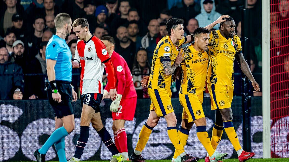 ROTTERDAM (OLANDA) (ITALPRESS) – A differenza di quanto accaduto appena due settimane fa, questa volta l’Olanda non riserva brutte sorprese per il calcio italiano. Nell’andata degli ottavi di Champions, infatti, l’Inter si impone per 2-0 contro il Feyenoord, ipotecando la qualificazione ai quarti. Al De Kuip, a cavallo tra i due tempi, Thuram e Lautaro segnano le due reti decisive: nella ripresa Zielinski ha fallito il calcio di rigore del possibile 3-0. Dopo una prima fase di studio, la squadra di Inzaghi riesce a prendere le redini della partita, spegnendo l’ardore della formazione olandese. I nerazzurri si presentano a Rotterdam in totale emergenza sulle corsie laterali con Dumfries come unico esterno di ruolo a disposizione: sono dunque Bastoni e Dumfries ad intercambiarsi sulla fascia sinistra per sopperire all’emergenza. Non se la passa meglio il Feyenoord, privo di un paio di titolari, tra cui Timber, Stengs, Trauner e Milambo. Solo in avvio di partita l’Inter soffre l’aggressività dei padroni di casa e pecca di frenesia quando in possesso di palla. Già dopo tre minuti Martinez deve sporcare i guanti, parando il tentativo dalla sinistra di Osman, uno dei più pimpanti tra le fila degli olandesi. Col passare dei minuti, però, i ragazzi di Inzaghi prendono le misure degli avversari, chiudendo la prima frazione in crescendo. L’Inter ha il merito di sbloccare il risultato alla prima vera occasione del match: al 38′, infatti, su cross di Barella, Thuram sigla l’1-0 in acrobazia, spedendo la palla sotto l’incrocio. Nel finale di tempo Lautaro sfiora il raddoppio, trovando la pronta risposta di Wellenreuther che devia in angolo. Il gol dell’argentino è però parte del copione della serata e arriva al 50′ dopo un’azione insistita dei nerazzurri. Grazie ad una potente botta sotto l’incrocio da dentro l’area, Lautaro entra nella storia del club, diventando il miglior marcatore di tutti i tempi dell’Inter nella massima competizione. I padroni di casa cercano di reagire al 56′, scheggiando la traversa con Moder. L’Inter, però, si riorganizza subito e al 63′ il Var richiama l’attenzione di Eskas per un contatto falloso di Mitchell su Thuram. Il fischietto norvegese assegna così il rigore, ma dal dischetto Zielinski fallisce la rete della sicurezza, facendosi ipnotizzare da Wellenreuther. Ospiti vicini al tris anche con Dumfries al 66′, il cui diagonale termina di poco a lato. Il finale è di pura gestione e non riserva particolari squilli nè da una parte nè dall’altra. Il ritorno è in programma martedì prossimo a San Siro alle ore 21.– Foto Ipa Agency –(ITALPRESS).