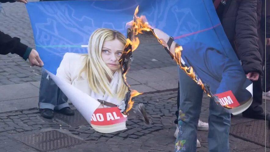 ROMA (ITALPRESS) – Nel corso del corteo per il no al referendum, organizzato a Roma, in piazza dell’Esquilino, alcuni manifestanti hanno incendiato le immagini simboliche della presidente Giorgia Meloni raffigurata mentre tiene al guinzaglio il ministro Carlo Nordio, con una museruola, accanto alla scritta: “No al vostro referendum”.Poco dopo è stato dato alle fiamme anche un altro manifesto che mostrava la premier mentre stringe la mano a Benjamin Netanyahu.Alla manifestazione, promossa da Potere al Popolo, hanno aderito diverse realtà, dai collettivi studenteschi ai movimenti per la Palestina tra cui il Global Movement to Gaza, fino ai movimenti di lotta per la casa, i centri sociali e l’Usb.A fuoco anche una bandiera degli Stati Uniti e un ritratto delpresidente Donald Trump.– foto Ipa Agency – (ITALPRESS).
