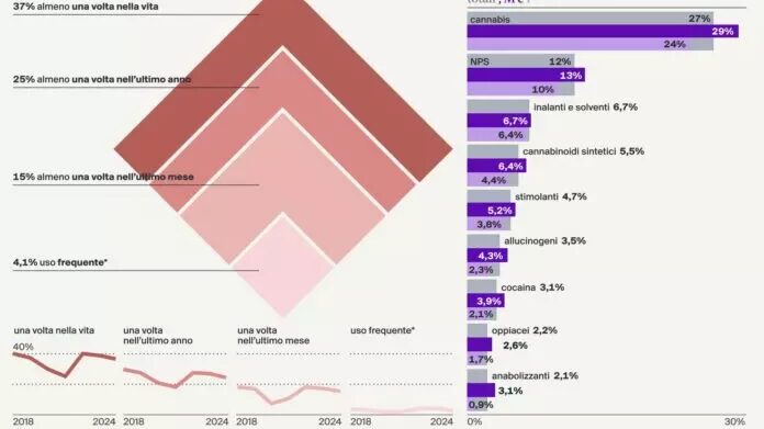 ROMA (ITALPRESS) – Il 2024 delinea un quadro articolato del fenomeno droga in Italia. Da un lato, i dati confermano una sostanziale stabilità nei principali indicatori epidemiologici con accessi ai servizi di trattamento che non evidenziano scostamenti significativi rispetto agli anni precedenti, dall’altro, emergono elementi di trasformazione qualitativa del mercato, con nuove sfide per la salute pubblica e la sicurezza. Le sostanze più tradizionali, come cannabis, cocaina e oppiacei, continuano a rappresentare la parte dominante del mercato illecito, ma si riconferma anche una diversificazione dell’offerta, con la permanenza dell’inserimento di Nuove Sostanze Psicoattive (NPS) (tra cui catinoni sintetici, cannabinoidi sintetici e oppioidi sintetici). Tuttavia, i dati disponibili confermano che tali sostanze, pur rappresentando un rischio sanitario rilevante, per fortuna, ad oggi non evidenziano una diffusione ampia nella popolazione giovanile. Al contrario, i consumi tra gli studenti risultano in calo per quasi tutte le categorie di sostanze. E’ quanto emerge dalla relazione annuale al Parlamento sul fenomeno delle tossicodipendenze in Italia del 2025, presentata dal Dipartimento delle politiche contro la droga e le altre dipendenze della Presidenza del Consiglio. “L’intensificazione del lavoro rispetto ad anni passati non ha cercato modifiche legislative, ma si è realizzata sul piano della prevenzione, della cura e del recupero”, scrive il sottosegretario di Stato alla Presidenza del Consiglio con delega alle politiche antidroga, Alfredo Mantovano, nella prefazione.Nel 2024, il consumo di sostanze tra gli studenti è diminuito rispetto all’anno precedente. Dal 2023 al 2024, il consumo di cannabinoidi è passato dal 22% al 21%, le NPS dal 6,4% al 5,8%, i cannabinoidi sintetici dal 4,6% al 3,5%, gli stimolanti dal 2,9% al 2,4%, la cocaina dal 2,2% all’1,8%, gli allucinogeni dal 2,0% all’1,2%. Solo gli oppiacei restano stabili all’1,2%. Questi dati indicano una diminuzione del consumo di sostanze più pericolose e complesse, a fronte di un uso ancora significativo della cannabis, che rimane la droga più diffusa tra i giovani. Questa tendenza positiva sembra riflettere l’efficacia delle attività di prevenzione svolte nei contesti territoriali e nelle scuole oltrechè un possibile mutamento nei comportamenti giovanili e nella percezione del rischio.Nel 2024 il NEWS-D, il sistema di allerta rapida per le droghe, ha identificato 79 Nuove Sostanze Psicoattive circolanti sul territorio nazionale. Si tratta di sostanze appartenenti principalmente alle classi dei catinoni sintetici (27%), dei cannabinoidi sintetici (24%), delle fenetilamine (8%) e degli oppioidi sintetici (8%).Il 32% delle segnalazioni in entrata provenienti dall’Italia ha interessato sostanze d’abuso classiche, già inserite nelle Tabelle del DPR n.309/1990, quali delta-9-THC, cocaina, metamfetamina, MDMA (ecstasy), amfetamina, eroina, LSD, psilocina, GBL.Nell’ambito delle azioni previste nel “Piano nazionale di prevenzione contro l’uso improprio di Fentanyl e di altri oppioidi sintetici”, attivato nel mese di marzo 2024, il NEWS-D si è occupato della raccolta e diffusione di documenti relativi all’individuazione sul territorio nazionale di fentanyl e di altri oppioidi sintetici.Nel 2024, in Italia sono state sequestrate circa 11 tonnellate di cocaina: un quantitativo sensibilmente inferiore rispetto agli anni precedenti, ma che continua a rappresentare, per il quinto anno consecutivo, circa un quarto del totale delle sostanze stupefacenti sequestrate a livello nazionale. In questo contesto, il porto di Gioia Tauro svolge un ruolo cruciale per il traffico di cocaina, con il 40% dei sequestri totali realizzati in Calabria.La cocaina si conferma una delle sostanze con il maggiore impatto sanitario e sociale in Italia. Rappresenta il 35% dei decessi droga-correlati (in linea con il 2023), il 30% dei ricoveri ospedalieri legati a droghe (costante rispetto all’anno precedente). Il 23% degli utenti SerD risulta in carico per cocaina come sostanza primaria di trattamento a cui si aggiungono il 3,3% degli utenti per crack. La cocaina viene frequentemente associata al policonsumo. La sua presenza è rilevata nel 48% delle intossicazioni acute letali secondo i dati riportati dalle tossicologie forensi.Le analisi effettuate dalle Forze di Polizia su campioni sequestrati evidenziano un incremento dei sequestri di cocaina in polvere a partire dal 2020, con una purezza media che negli ultimi anni si è stabilizzata fra il 67% e il 70%. Per quanto riguarda il crack, oltre a un andamento crescente dei sequestri dal 2019, si registra un aumento significativo dei campioni con un’elevata concentrazione di principio attivo, fino a raggiungere il 90% di purezza.Parallelamente, le denunce per traffico e detenzione di cocaina e crack (art.73 del DPR n.309/1990) sono quasi raddoppiate dal 2000, passando da circa 8.500 a 14.500; la stessa tendenza riguarda le denunce per associazione finalizzata al traffico illecito (art. 74 del DPR n.309/90).Particolarmente preoccupante è l’incremento delle denunce che coinvolgono minori: nel 2024, un quarto dei minorenni denunciati ovvero 300 under 18 è stato segnalato per reati legati alla cocaina, in netto aumento rispetto ai primi anni 2000, quando questa quota non superava il 10%.Nell’ultimo anno, in Italia sono stati sequestrati quasi 350 chilogrammi di eroina e altri oppiacei, una quantità che rappresenta meno dell’1% delle 58 tonnellate di sostanze stupefacenti complessivamente intercettate sul territorio nazionale, confermando il calo iniziato nel 2019 e che si è accentuato soprattutto negli ultimi due anni. Anche le denunce per traffico e detenzione illecita e per associazione finalizzata al traffico di eroina e oppiacei, che nel 2024 si attestano intorno al 4% di quelle avvenute nell’anno per violazione della normativa sugli stupefacenti, risulta