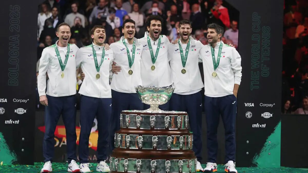 BOLOGNA (ITALPRESS) – L’Italia vince la quarta Coppa Davis della sua storia, la terza consecutiva. Sul cemento indoor di Bologna è Flavio Cobolli a regalare la prima Insalatiera in casa agli azzurri, che si impongono in finale sulla Spagna col punteggio di 2-0. Dopo il successo di Matteo Berrettini per 6-3 6-4 su Pablo Carreno-Busta nel primo singolare, Cobolli chiude la contesa battendo Jaume Munar per 1-6 7-6(5) 7-5. L’Italia diventa così la prima nazione a trionfare per tre anni di fila dal 1971, dopo l’eliminazione del Challenge Round, ovvero la regola per cui i campioni in carica giocavano solo la finale l’anno successivo. “Questo era il mio sogno, siamo una squadra molto unita. Sono fiero di tutti noi e di questa squadra fa parte anche questo pubblico fantastico. Si ripete da tre giorni il giorno più bello della mia vita” le parole di Cobolli dopo la vittoria contro Munar che ha regalato la Coppa Davis all’Italia.– foto Ipa Agency –(ITALPRESS).