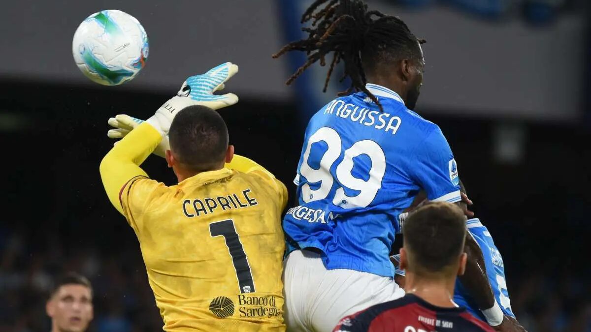 NAPOLI (ITALPRESS) – Il Cagliari non ferma i Campioni d’Italia. Il Napoli non stecca la prima al ‘Maradonà nonostante i coraggiosi ragazzi sardi abbiano gettato in campo cuore ed orgoglio per 95’. Nell’ultimo tentativo offensivo è stato Anguissa a trovare il gol che ha sbloccato la partita. Per i sardi, che hanno centuplicato le forze pur di ottenere un punto voluto, sudato ed, alla fine, anche meritato, un’autentica beffa. I campani non hanno trovato il bandolo della matassa finendo nell’imbuto predisposto da mister Pisacane. Inutili tutti i tentativi di sfondare il muro di gomma allestito dai sardi fino al cross di Olivera ed al tocco vincente di Anguissa. In avvio Spinazzola cerca Lucca (4′) che non ci arriva. Al 12′ retropassaggio rischioso di Prati, Caprile spazza. Gli azzurri pressano, al 18′ cross di Spinazzola per Lucca che non arriva alla deviazione di un soffio. Zappa rischia il secondo cartellino giallo, quindi Caprile non si fa sorprendere dalla punizione di De Bruyne. Il predominio azzurro è netto ma il portiere sardo non suda particolarmente. Anzi è Palestra che sfonda a sinistra, la difesa campana si salva in extremis. Un tiro di De Bruyne alto di un metro (39′), Zappa crossa (41′), Prati va di testa, palla alta. Al 44′ dribbling di McTominay e Caprile sventa in corner il tiro dello scozzese. Nella ripresa continua il pressing partenopeo per cercare il gol. Caprile respinge un tiro di Spinazzola quindi Politano ruba palla a Folorunsho e va al tiro, palla fuori di poco. Al 29′, però, Luvumbo dalla destra mette un pallone sul secondo palo: Folorunsho non ci arriva di pochissimo. Il Cagliari continua con un atteggiamento prettamente difensivo chiudendo tutti i varchi ai campioni d’Italia. Si gioca ad una porta, quella rossoblù, ma non è facile superare l’arcigna difesa dei sardi. I campani collezionano angoli e continuano a pressare, gli ospiti cercano di allentare la tensione, un errore difensivo per poco non lancia Lang. McTominay non sorprende Caprile (48′), il Napoli continua ad attaccare fino al 95′ poi Anguissa trova la zampata su cross di Olivera e gli azzurri esultano. – Foto Ipa Agency –(ITALPRESS).