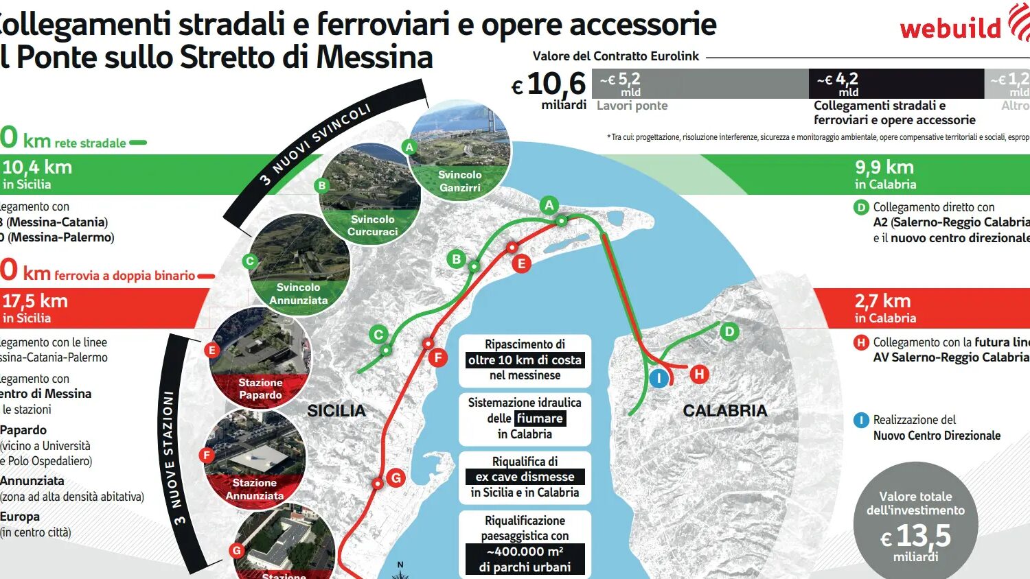 ROMA (ITALPRESS) – Per decenni si è immaginato il Ponte sullo Stretto come un gesto ingegneristico assoluto, un arco sospeso nel vuoto, un record di acciaio lungo 3.300 metri, un’impresa che cambierà per sempre la geografia del Mediterraneo. Eppure, la verità più sorprendente è che questa campata epica, pur essendo il cuore simbolico del progetto, rappresenta soltanto una parte dell’investimento complessivo.Il ponte da solo vale circa 5,2 miliardi di euro, pari a poco meno del 40% dei 13,5 miliardi previsti dalla programmazione nazionale. La parte più estesa, strutturata e impegnativa del progetto è un’altra, ovvero un “Continente sommerso”, un’infrastruttura nell’infrastruttura che mette in piedi una nuova mobilità per il Mezzogiorno. In questo continente ci sono strade, ferrovie, stazioni, gallerie, viadotti, sistemi di accesso, opere ambientali, parchi, riqualificazioni idrauliche, interventi sulle fiumare, recuperi di cave e ridisegni urbani.Sono oltre 4,1 miliardi di euro di collegamenti e opere accessorie, pensate per integrare Sicilia e Calabria nel grande corridoio europeo Scandinavo-Mediterraneo e per trasformare l’area dello Stretto in uno snodo continentale. E’ proprio questo sistema di infrastrutture altamente complesse e innovative, a rendere possibile il ponte stesso, l’emersione finale di un “Continente sommerso” che ridisegnerà territori, mobilità, economie, stili di vita.Ben prima di salire sul Ponte sullo Stretto, il “Continente sommerso” emerge già in Calabria, dove un sistema di collegamenti stradali e ferroviari riplasma il territorio intorno a Villa San Giovanni. Qui il valore delle opere accessorie raggiunge circa un quarto dell’investimento complessivo destinato ai collegamenti, in un’area che diventa porta d’ingresso dell’Europa continentale verso la Sicilia.Sul versante calabrese nasceranno infatti 9,9 chilometri di nuove strade, con il 41% del tracciato in galleria. Le rampe principali (Piale, Minasi, Campanella) si svilupperanno come grandi tunnel naturali, integrati da viadotti e tratti all’aperto, per saldare il ponte all’autostrada A2 all’interno di un sistema progettato per distribuire i flussi senza sovraccaricare la viabilità urbana.Parallelamente, prenderà forma un nuovo tratto ferroviario di 2,7 chilometri, in cui l’84% del percorso sarà in sotterraneo. Questo nodo ferroviario darà vita alla giuntura strategica tra la linea tirrenica storica, la futura linea AV/AC Salerno-Reggio Calabria e l’accesso ferroviario al ponte, realizzando così il primo tassello di una continuità ferroviaria che dal Sud Italia arriverà, senza interruzioni, fino a Roma, Milano, Monaco, Berlino, Oslo.Sempre sul versante calabrese, a Piale, sorgerà il Centro Direzionale, un complesso che ospiterà gli spazi operativi per la gestione del ponte: uffici, servizi, aree di ristorazione, un centro conferenze. E’ l’infrastruttura di comando di un sistema che avrà una vita operativa ininterrotta, giorno e notte, e che farà da piattaforma (tangibile ma soprattutto intangibile) al più grande attraversamento sospeso del mondo.Se in Calabria nascerà un nuovo sistema intermodale, capace di far dialogare il trasporto su ferro con quello su gomma, in Sicilia prenderà invece forma una nuova idea di mobilità urbana e regionale. L’isola è infatti il cuore pulsante del “Continente sommerso”, dove si concentra il 75% del valore complessivo delle opere di collegamento.Il sistema stradale prevede la costruzione di 10,4 chilometri di nuovi tracciati, con il 71% in galleria, attraverso gli abitati di Ganzirri, Curcuraci, Pace, Annunziata e Faro Superiore. Le grandi gallerie (Faro Superiore, Balena, Le Fosse) diventeranno le nuove arterie incaricate di liberare la città dal traffico e collegare l’A18 e l’A20 direttamente al ponte, senza attraversare il tessuto urbano. I viadotti Pantano, Curcuraci, Pace e Annunziata completeranno invece l’ossatura del sistema stradale.Nonostante gli interventi su strada siano notevoli, sarà la parte ferroviaria a generare il cambiamento più profondo. Il progetto prevede infatti la costruzione di 17,5 chilometri di linea ferroviaria, modellati per il 93% in galleria, una dorsale sotterranea che attraverserà Messina come una vera metropolitana, con tre nuove stazioni (Papardo, Annunziata, Europa) posizionate nei punti strategici della vita cittadina, come l’università, i poli ospedalieri, i quartieri più popolosi, il centro urbano. Papardo, nel dettaglio, sarà la porta della città accademica; Annunziata servirà la zona residenziale più densa; Europa sarà la stazione urbana di connessione tra la mobilità cittadina e la rete nazionale. In superficie non cambierà nulla, ma sotto i piedi dei cittadini nascerà una città nuova, più veloce, più sostenibile, più accessibile.A dispetto delle convinzioni diffuse, il progetto che punta alla riemersione del continente nascosto non è fatto solo di acciaio e gallerie, ma anche di opere ambientali e paesaggistiche. Una parte consistente dei materiali di scavo dei cantieri sarà riutilizzata per rilevati, recuperi ambientali, opere di ripascimento del litorale tirrenico, attivando così un ciclo virtuoso che trasforma gli scavi in risorse, riducendo impatti e costi ambientali.Sul piano idraulico, sarà ridisegnato l’assetto di fiumare cruciali per la stabilità del territorio, come Gibia, Laticogna, Serro della Torre, Piria e Prestianni. In parallelo, le cave dismesse diventeranno parchi e aree verdi, mentre in Calabria saranno riqualificati i laghetti del bacino del Petrace. Complessivamente nasceranno oltre 400.000 m² di parchi urbani, un sistema diffuso che restituisce qualità ambientale ai territori attraversati.In sostanza, il “Continente sommerso” non è un’aggiunta al ponte, è ciò che permette al ponte di funzionare e ciò che, una volta ultimato, ridisegnerà la geografia della mobilità italiana. E’ un sis