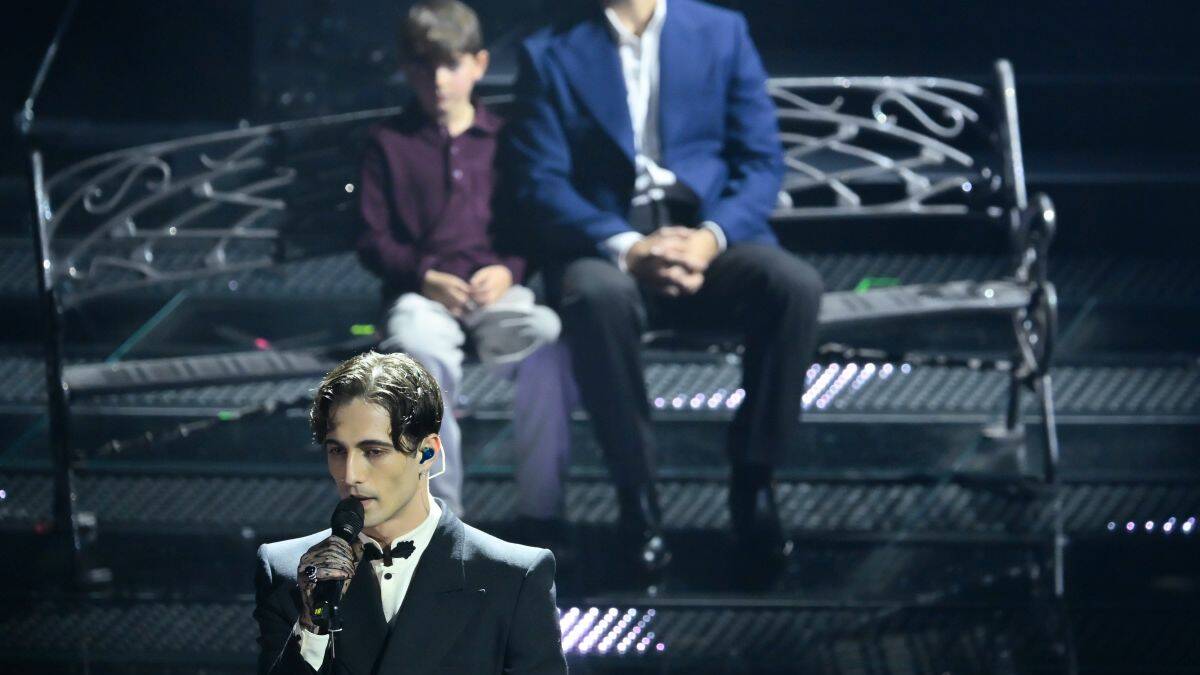 SANREMO (ITALPRESS) – Damiano David – guanto in velo ricamato, abito scuro, camicia con pistagna chiusa da un alamaro nero – apre di fatto la seconda serata del 75° Festival di Sanremo con una interpretazione da brividi di “Felicità” di Lucio Dalla. Un omaggio al cantautore bolognese, autore di pagine uniche della musica italiana, in cui brilla anche l’orchestra di Sanremo. La coreografia ha visto, dietro Damiano David, una panchina su cui era seduto Alessandro Borghi con il piccolo Vittorio. “Abbiamo pensato che Vittorio fosse la persona giusta per rappresentare questo passaggio alle future generazioni”, ha detto Borghi abbracciando il bambino visibilmente emozionato. -foto Ipa Agency-(ITALPRESS)